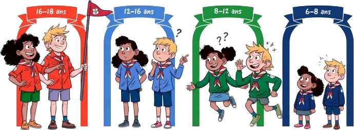 Pas de prise de tête : chaque jeune rejoint la section de son année de naissance, pour vivre l'aventure avec des scouts de son âge :